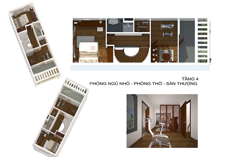 Sau những không gian sang trọng, hiện đại, có một góc riêng với lối bày trí rất trang nghiêm và cổ điển dành cho không gian tín ngưỡng thờ phật. Bàn thờ phật bằng gỗ có họa tiết cầu kỳ và "xưa", đặt bên cạnh là một chậu cây bonsai rất gần gũi và trang trọng. Nhưng để không bị lạc lõng trong toàn bộ thiết kế của ngôi nhà, khu vực này vẫn đan xen những chi tiết sang trọng vào bên trong như rèm cửa, đèn trần.
