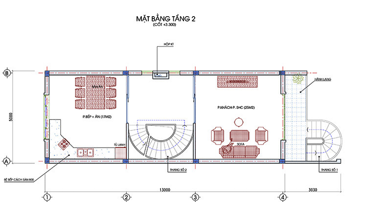 Không gian bên trong nhà đáp ứng đầy đủ không gian sinh hoạt của một gia đình Việt Nam, bao gồm phòng khách, phòng ngủ, nhà vệ sinh, nhà bếp, phòng sinh hoạt gia đình và phòng làm việc. Tất cả được phân chia hợp lý để phù hợp với diện tích vừa phải. Phòng khách được bố trí vị trí trung tâm có không gian lớn.
